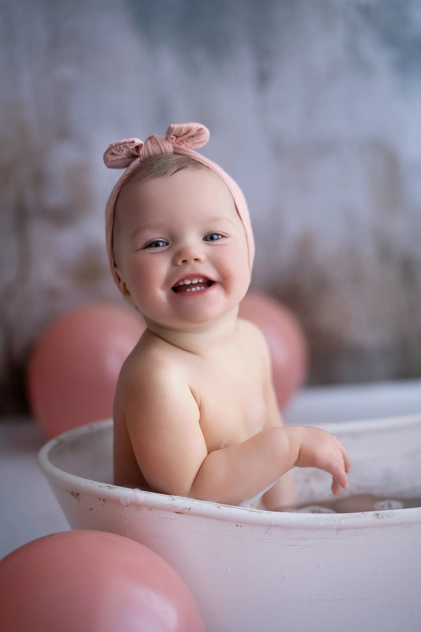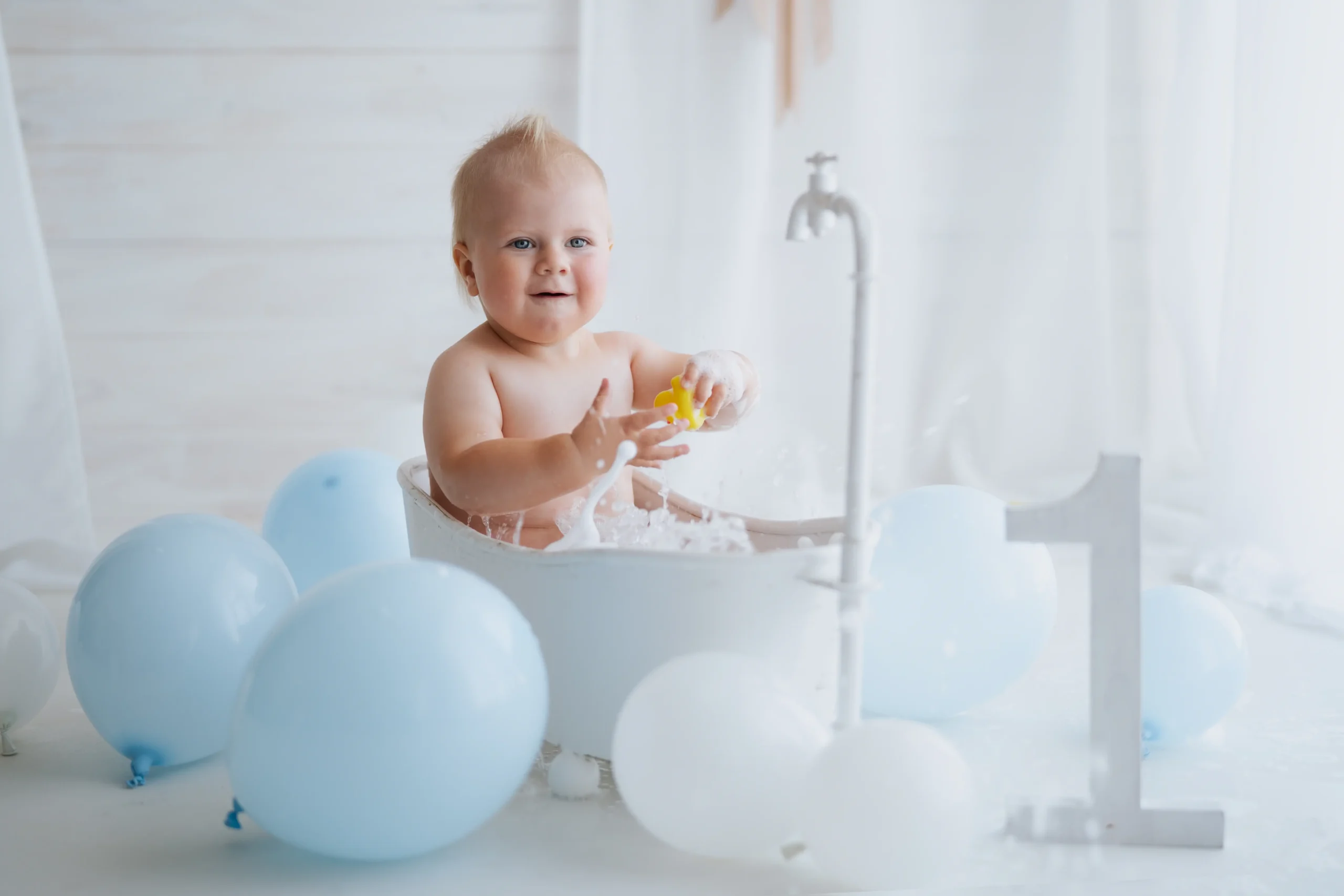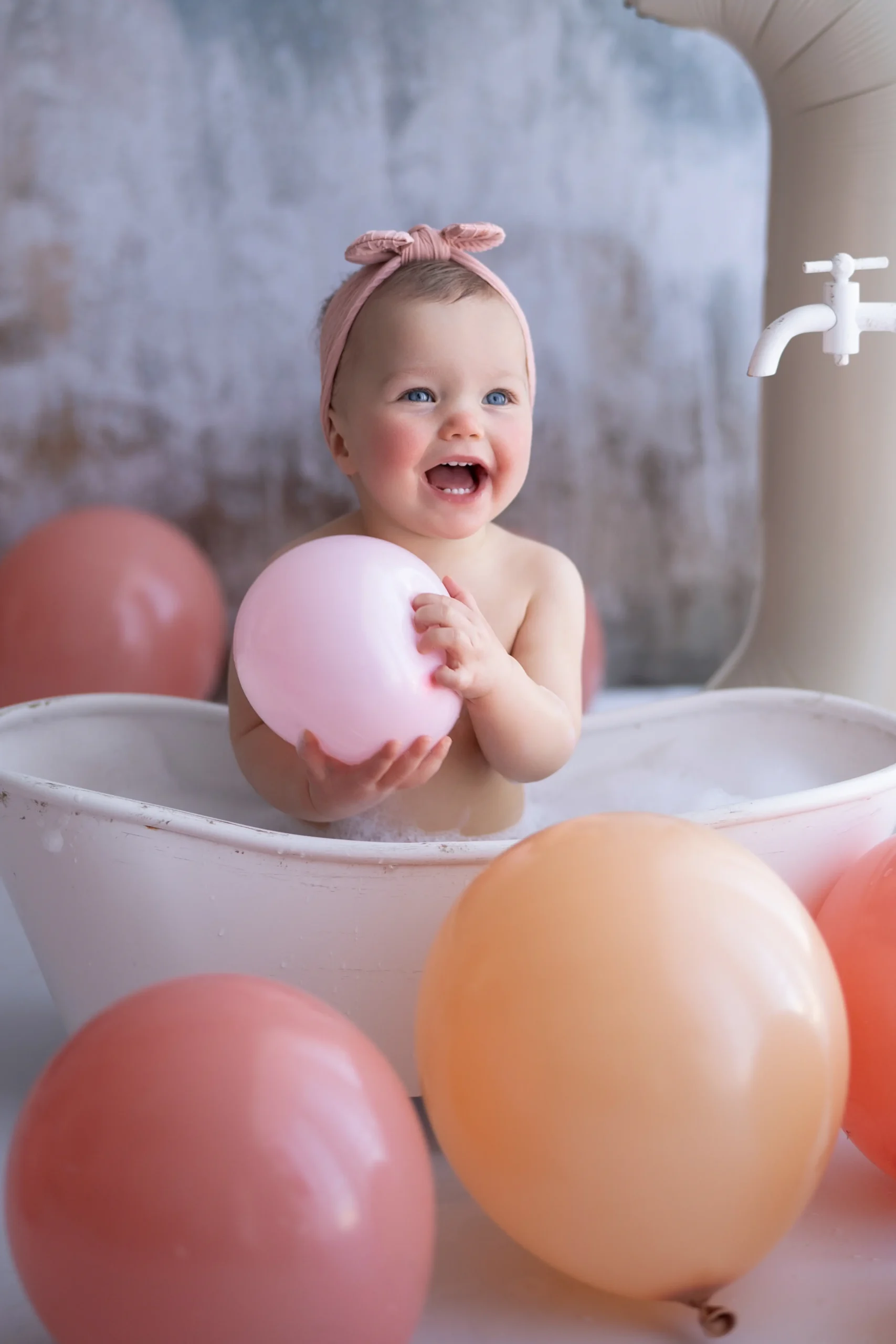 Na sesji roczkowej możemy wykonać ujęcia w mini- wanience z wodą z pianką – to świetna zabawa dla